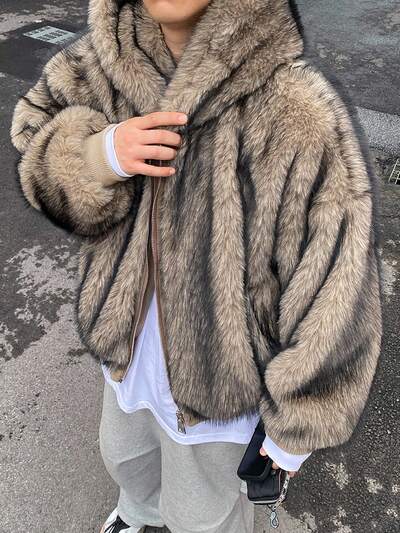 Casaco com Capuz Marrom Forrado em Tecido Peludo com Bordado, para Homens no Outono-66%