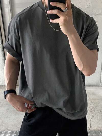 Camiseta Masculina Desgastada e Lavada em Cinza Escuro Profundo, Gola Redonda, Verão-44%