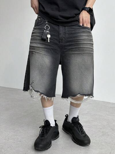 Shorts Denim Masculina Preta Desgastada e Rasgada, VerãoUS$ 18,43US$ 28,39