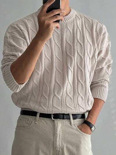 Suéter de Gola Careca Texturizado Branco Masculino, Outono/Inverno-26%