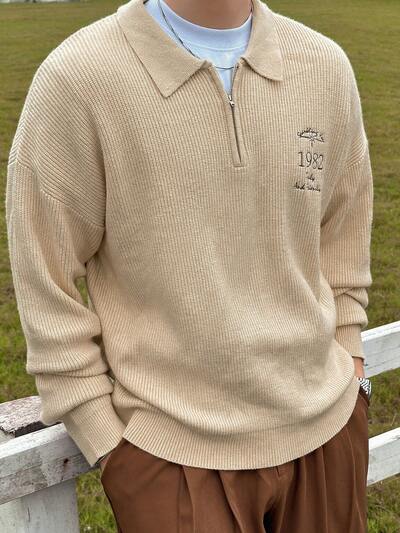 Suéter Cáqui de Outono para Homens com Bordado de Letra e Zíper Parcial-60%
