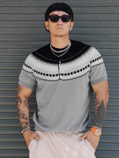 Suéter de Malha Jacquard de Padrão Geométrico Masculino para Primavera/Verão-67%