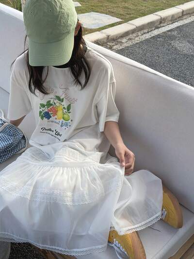 Vestido de Verão de Manga Curta para Uso Casual, de Férias e Diário, com Estampa de Letra e Fruta, Decote Redondo, para Meninas Pré-Adolescentes-68%