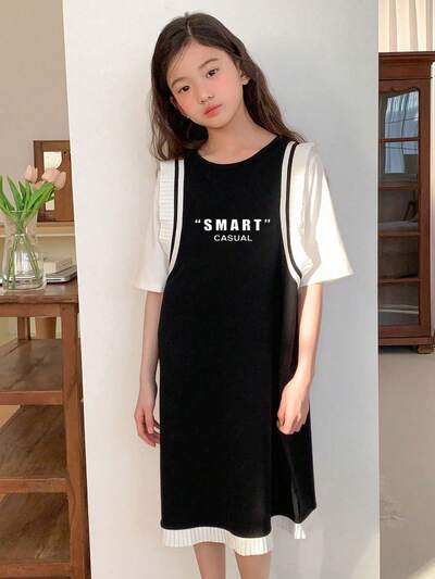 Vestido Casual com Impressão de Letra 2 em 1 para Meninas Pré-Adolescentes, Moda de Outono para Meninas Pré-Adolescentes, Roupas de Volta às Aulas