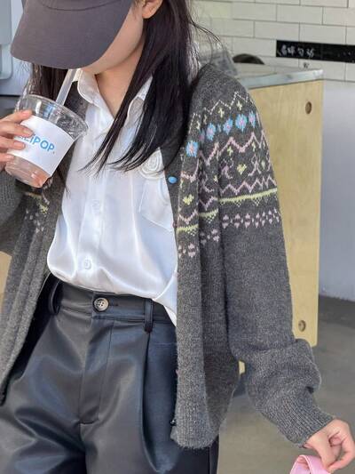 Cardigan com Botões na Frente e Padrão Geométrico Casual para Meninas Pré-Adolescentes, Outono/Inverno-43%