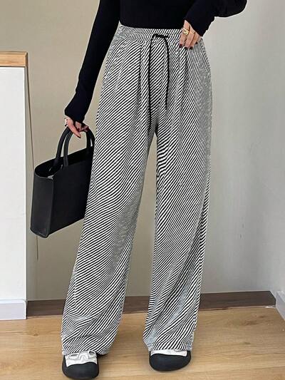 Calça Casual Feminina de Perna Larga com Cordão na Cintura, Listrada, Combinável, Roupas de Outono-37%