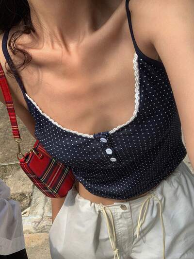 Regata Feminina com Estampa de Poá Completa de Renda e Recorte, Decote em V, Para Sair-49%