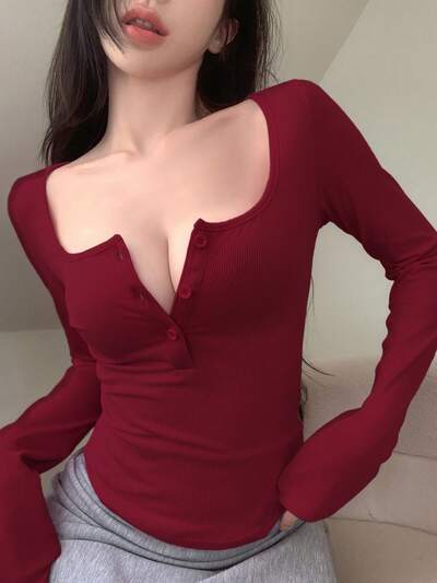 Camiseta com Decote em V, Manga Longa e Botões Até a Metade, Roupas de Outono, Roupas de Volta às Aulas-25%