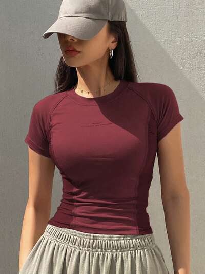 Camiseta feminina casual de verão com manga curta, cor sólida e ajuste slim-50%