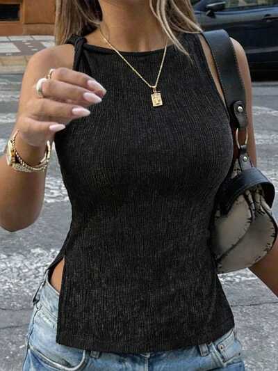 Regata Casual Feminina de Cor Sólida com Decote Redondo e Bainha com Fenda Lateral-14%